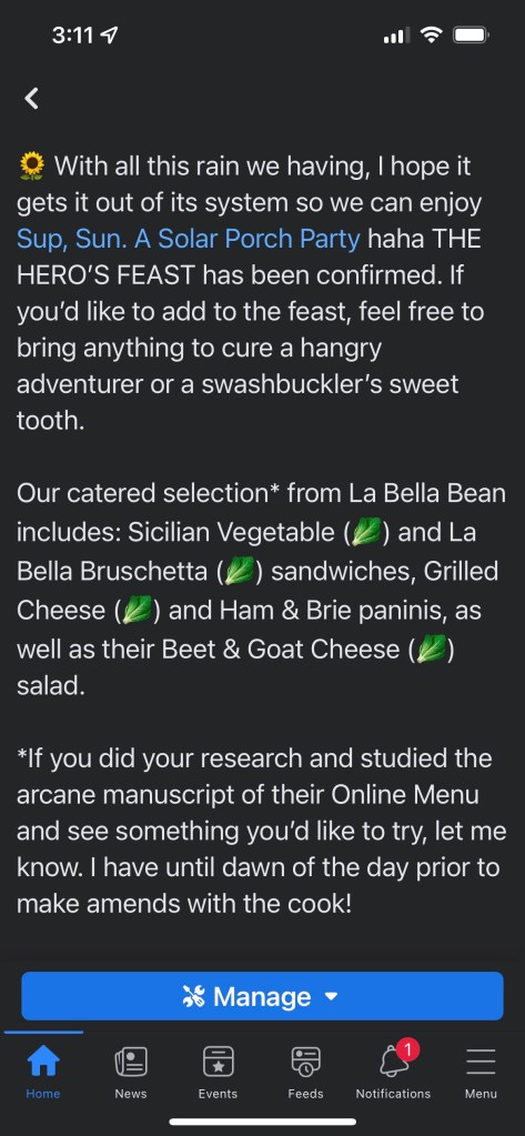 All of the guests that were invited and attended are Facebook savvy. The event had a personable and pun-based tone. All event communication was streamlined via Facebook with a few one-off conversations to discuss options on what they should bring to the table as well as any health updates concerning their COVID-19 status.